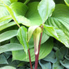 - Unique upright club-shaped spadix with hoods of green and maroon