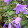 - Flat star-shaped five-lobed blue flowers with a white inner circle