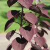 - Heart-shaped leaves emerge burgundy-purple with a contrasting yellow-green veining