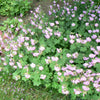 Geranium x cantabrigiense 'Biokovo'- Five-petaled white flowers tinged with pink at the base of each petal