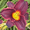Hemerocallis 'Strutter's Ball'- Velvety burgundy flowers have a silver-white watermark, silky halo and a lemon-green throat