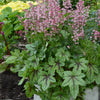 Heucherella x 'Pink Fizz'- Large deeply lobed silvery-green leaves with rich wine-red veins