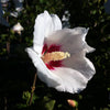 Hibiscus syriacus 'Red Heart'- Single white flowers with a red eye
