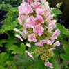 Hydrangea quercifolia 'Ruby Slippers'- Cone-shaped mass of loosely packed white florets ripen to a bright pink