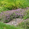 - Tiny purple to deep pink flowers mass over dark green foliage